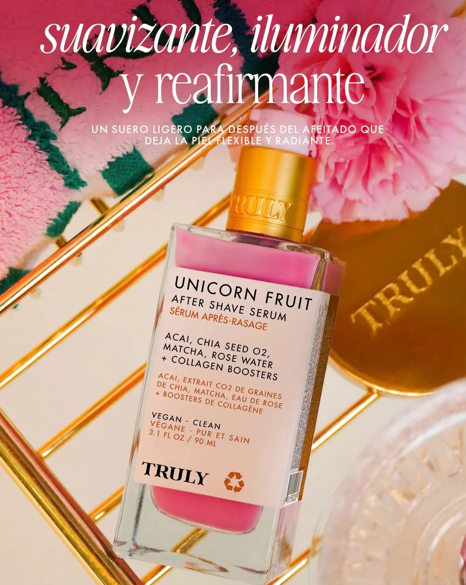 El Unicorn Fruit After Shave Serum de TRULY transforma tu piel después de la depilación: la hidrata, la ilumina y la deja increíblemente suave. 🌈 Su mezcla de açaí, matcha, agua de rosas y colágeno restaura la elasticidad y te regala una piel radiante y tersa todo el día. ✨